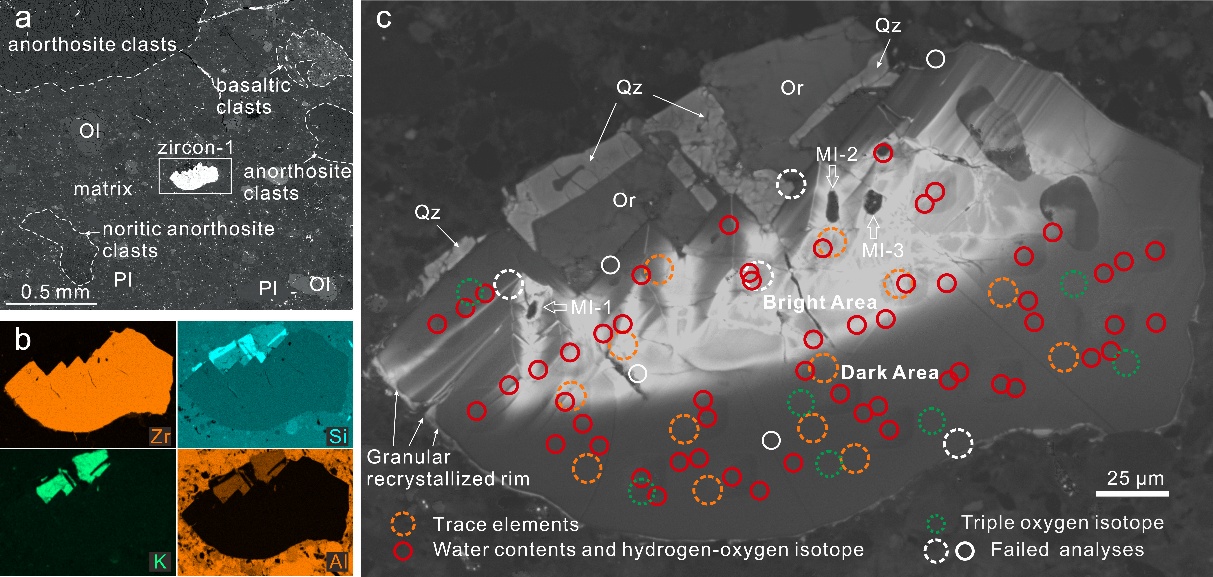 月球,这个曾长期被认为极度干燥的星球,近20年来其内部已经被证明含有一定量的水。这些内部水的来源——究竟是与生俱来的“内生水”,还是后期天体撞击带来的“外生水”——就成为当今行星科学研究中一个备受争议的谜题。早期研究多依赖磷灰石、火山玻璃、熔体包裹体等研究对象,但这些研究对象易受岩浆去气、太阳风注入、宇宙射线散裂及地球污染等后期过程改造,难以追溯原始水源。相比之下,锆石具有较好的物理化学稳定性,能够有效抵抗后期扰动,成为保存原始岩浆水信息的理想矿物载体。