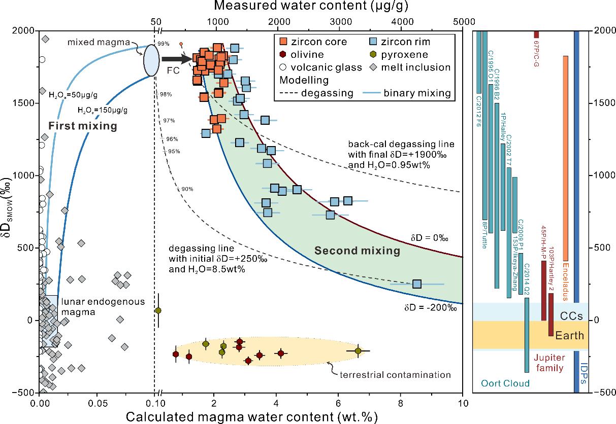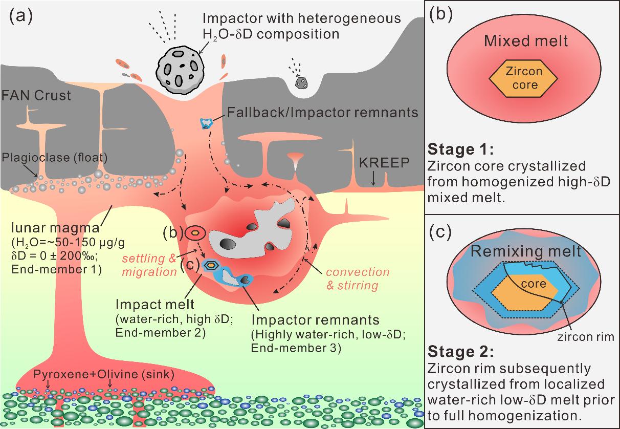 分析结果表明该锆石在显微结构和地球化学特征上均呈现出显著的核-边分带性(图1- 3):核部晶体形态相对完整,微量元素含量较高,具有相对均一的水含量(735-1164ppm)和极高的氢同位素组成(δD为+1320‰至+1882‰);边部显微结构复杂,微量元素含量比核部更低,展现出明显的水含量(879至4268 μg/g)与δD(+1879‰至+250‰)负相关趋势。结合地球化学与岩石学特征分析,该锆石特殊的H2O-δD体系无法通过岩浆去气模型进行解释,同时也排除了后期陆地混染和太空风化等次生干扰,我们推断该锆石的核-边组分特征反映了两阶段的岩浆混合过程(图3)。其异常的化学组成和同位素特征指示了外源撞击作用的对月球内部水的显著贡献与改造。
