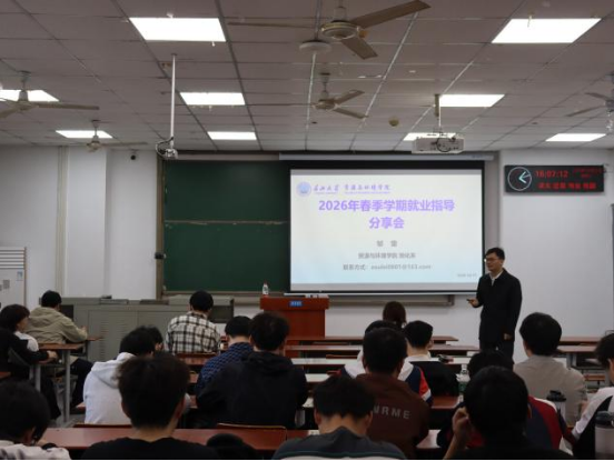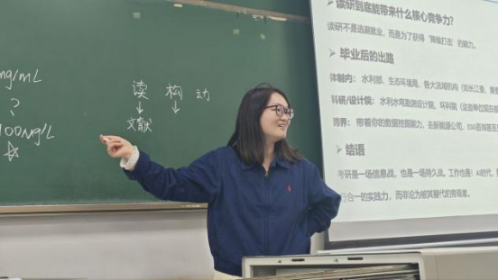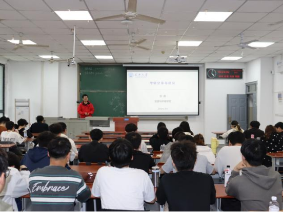 廉晶晶、陶泽、祝贤彬、赵日新四位老师率先开讲。廉晶晶老师梳理了不同专业方向的考研院校梯队与就业去向,建议同学们结合个人兴趣与行业趋势确定主攻领域。陶泽老师以“至少一万小时的持续投入”为题,回顾了从迷茫到突破的科研心路,强调成功的关键在于低谷时稳住心态、坚定向前。祝贤彬老师围绕“数据赋能环境”主题,鼓励同学们通过阅读文献构建独立思维体系,并系统介绍了体制内、科研及跨界等多元就业路径;赵日新老师立足专业,介绍了核心知识体系、团队承担的科研项目,并结合实际案例展示了专业的研究与应用场景,帮助同学们更具体地把握本专业的升学就业路径。