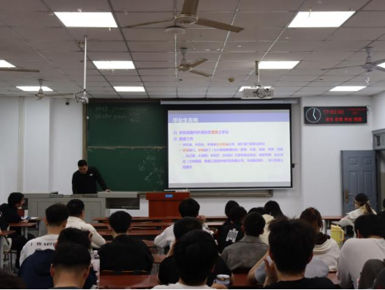 潘红忠、吴越、蒋兴超、周泽宇四位老师带来务实指导。潘红忠老师直接讲解了毕业四大去向“考公”“考编”“考研”“工作”之间的区别与需要准备的时间,并列举了专业去向最多的院校,根据不同生源的同学推荐了不同的院校;吴越老师分享了自己的考研经历,并告知同学们考研最重要的品质就是坐的住,沉下心来认真复习;蒋兴超老师首先和同学们分享了历届毕业生去向,从联系导师到复试准备逐一讲解;周泽宇老师则介绍了他研究生,博士生的经历,分享了他所在课题组的科研氛围与生活细节,让同学们对研究生生活有了更真切的感知。
