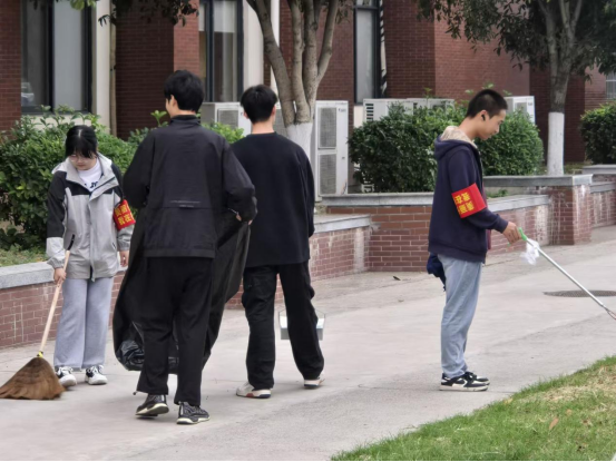 师生手持清扫工具,神情专注,斗志满满,于东校区小西门前广场集中开展清扫任务。活动中,大家你捡我扫,分工明确,默契配合,无论是校园主干道,还是室外停车场,都呈现出一片繁忙的景象。同学们挥舞着扫帚清理地面的灰尘与落叶,用垃圾拾物器细致地捡拾花坛间的烟头、纸屑等杂物,金黄落叶虽美,也成为清扫的重点对象。师生们干劲十足,对校园主干道、室外停车场、花坛边等地段进行地毯式清理。在大家的努力下,校园很快恢复了整洁与美丽,宛如一条金色丝带串联起了整个校园的活力与风光。