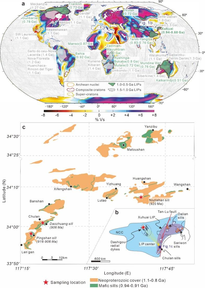 图1. (a)全球S波层析成像(150 km深度)与克拉通和元古代大火成岩省分布特征;(b)华北克拉通东部0.9 Ga徐淮大火成岩省的地质简图。图中展示了远场放射状岩墙群和近中心岩床群的分布;(c)华北克拉通东南缘褚兰岩床群的分布地质简图。